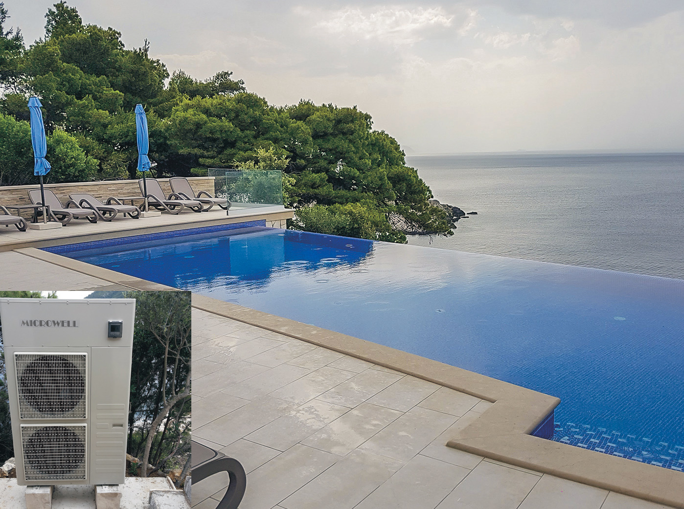 Kuća s apartmanima na Mljetu smještena je na odličnom mjestu, s prekrasnim pogledom na more i okolna otočja, u što se idealno uklapa ‘infinity’ bazen. Vodu bazena grije i, prema potrebi hladi, dizalica topline Microwell HP2600 kompaktne izvedbe, koja se nalazi ispod bazena, skrivena od pogleda. Toplinski učin je 28,4 kW (kod temperature zraka 26 °C, temperature vode 26 °C i relativne vlažnosti 63% ), a rashladni učin je 25 kW (kod temperature zraka 30 °C i temperature vode 35 °C).