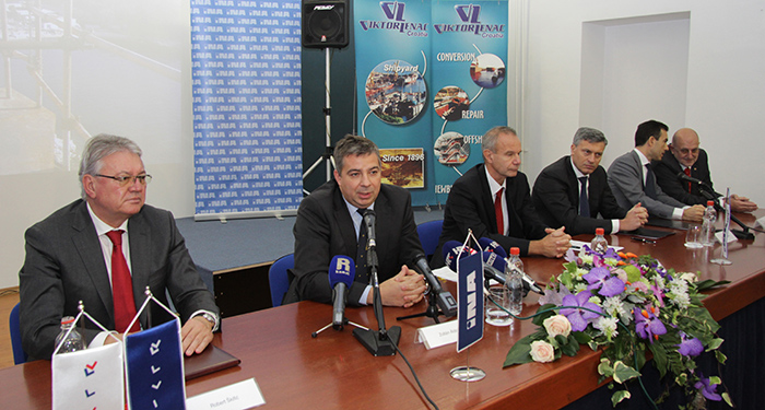 Fotografija s potpisivanja ugovora o projektu: gosp. Robert ŠKIFIĆ iz Brodogradilišta Viktor Lenac, gosp. Zoltán ÁLDOTT iz INA-e, gosp. Željko MLINARIĆ i Fabio CASTIGLIONI iz INAgipa te gosp. Daniele ROSSI iz tvrtke Rosetti Marino i gosp. Ognjen ANTUNAC iz tvrtke Rosetti d.o.o.
