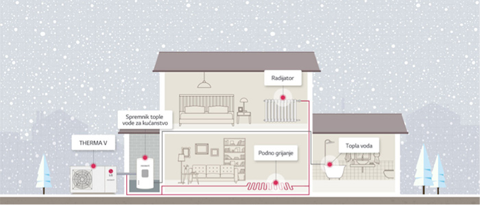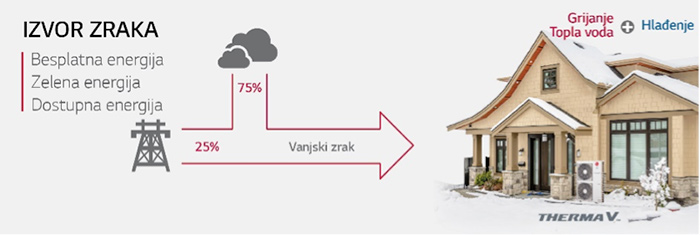 Sustav LG Therma V za svoj rad koristi električnu energiju (25%) i toplinsku energiju iz okolice (75%), a ima samo jednu vanjsku jedinicu koja se izravno povezuje s cijevima za vodu. Zato nema potrebe za plinskim priključkom, dimnjakom ili kotlovnicom, što štedi na prostoru, a i sam proces instalacije je kraći i jednostavniji.